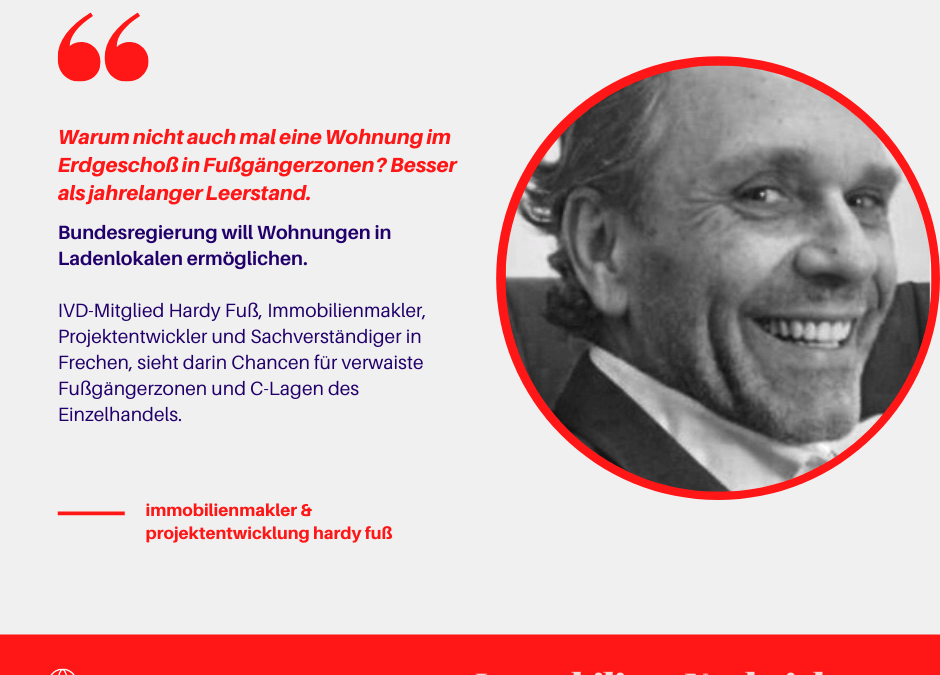 IVD-Mitglied Hardy Fuß, Immobilienmakler, Projektentwickler und Sachverständiger in Frechen, sieht darin Chancen für verwaiste Fußgängerzonen und C-Lagen des Einzelhandels: „Warum nicht auch mal eine Wohnung im Erdgeschoß in Fußgängerzonen? Besser als jahrelanger Leerstand.“